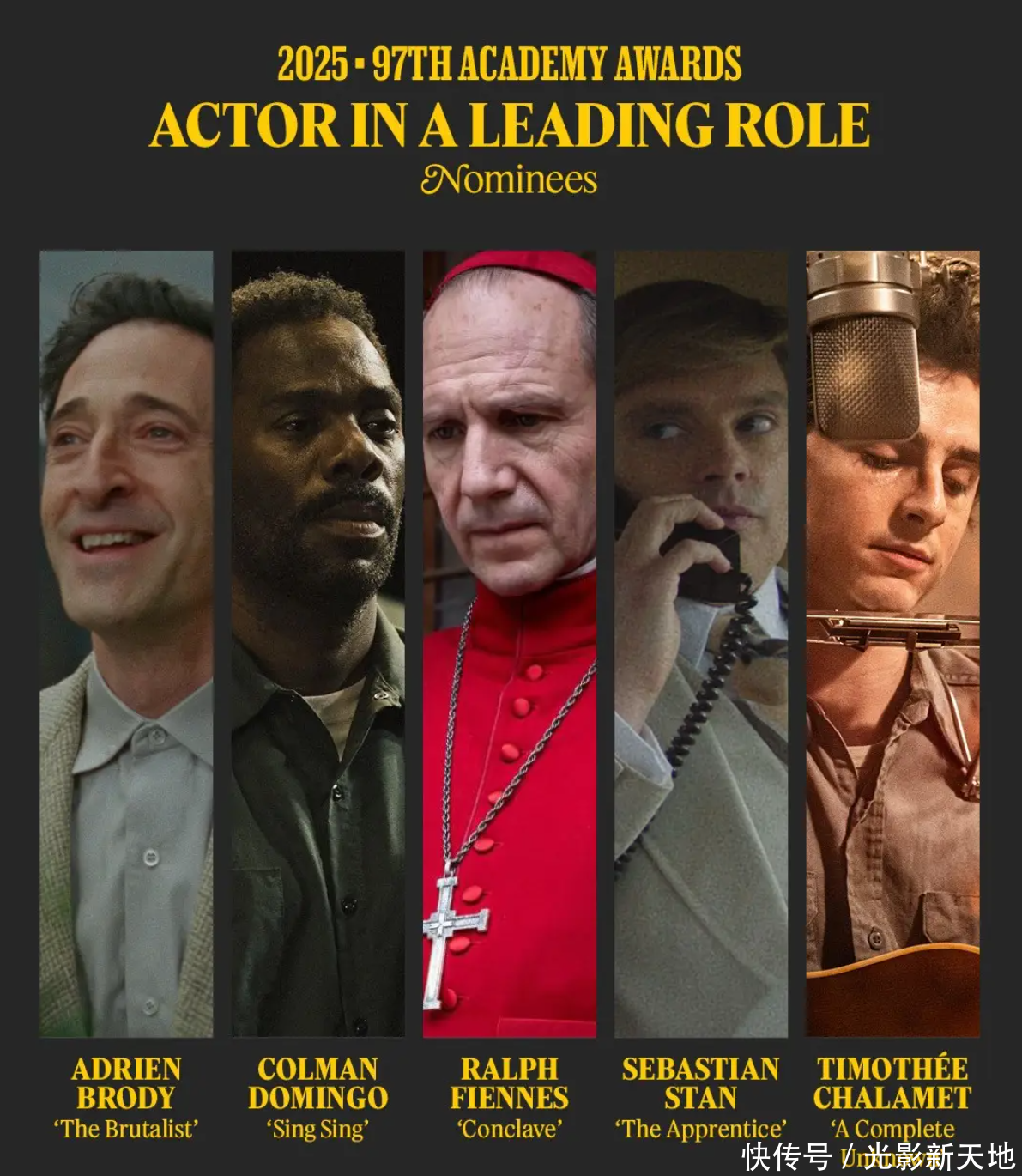 这个奖项其实悬念不大,五位提名演员,阿德里安·布劳迪的饰演着实是太亮眼了,《野蛮派》给了他相称大的清晰空间,他在电影里充分阐述出了狂喜、缅怀,吸毒后的散漫和迷离,以及幻灭感的基底。可以和他PK一下的是《隐秘会议》里的拉尔夫·费因斯,只不外脚色完毕很大,他莫得超过亮眼的饰演。