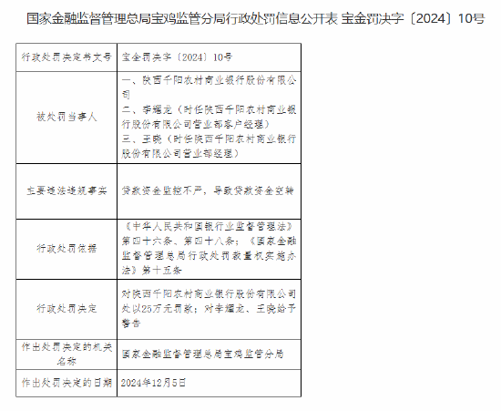 12月13日金融一线讯息,国度金融监督惩办总局宝鸡监管分局行政处罚信息公开披透露,陕西千阳农村买卖银行股份有限公司因贷款资金监控不严,导致贷款资金空转,被罚金25万元。